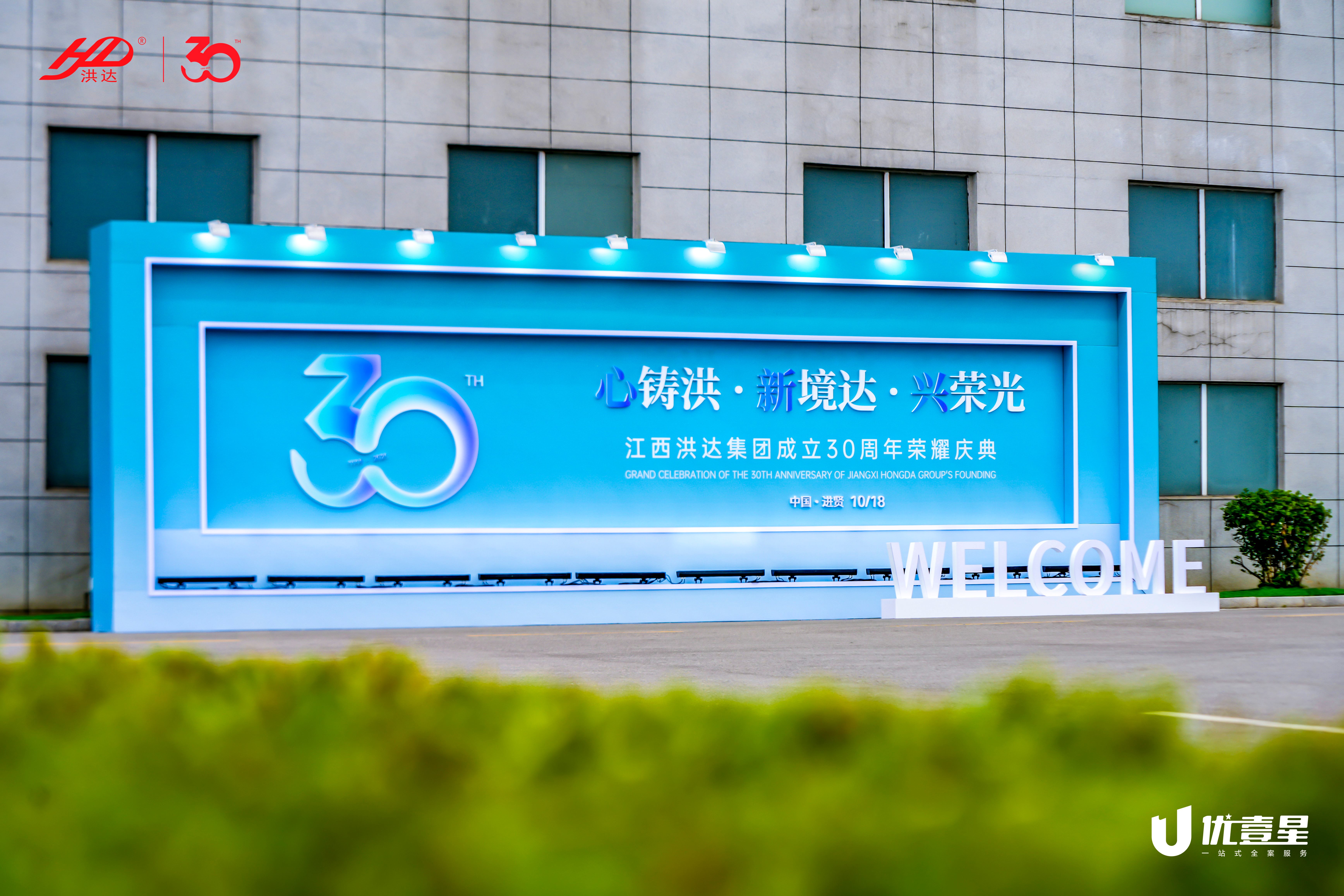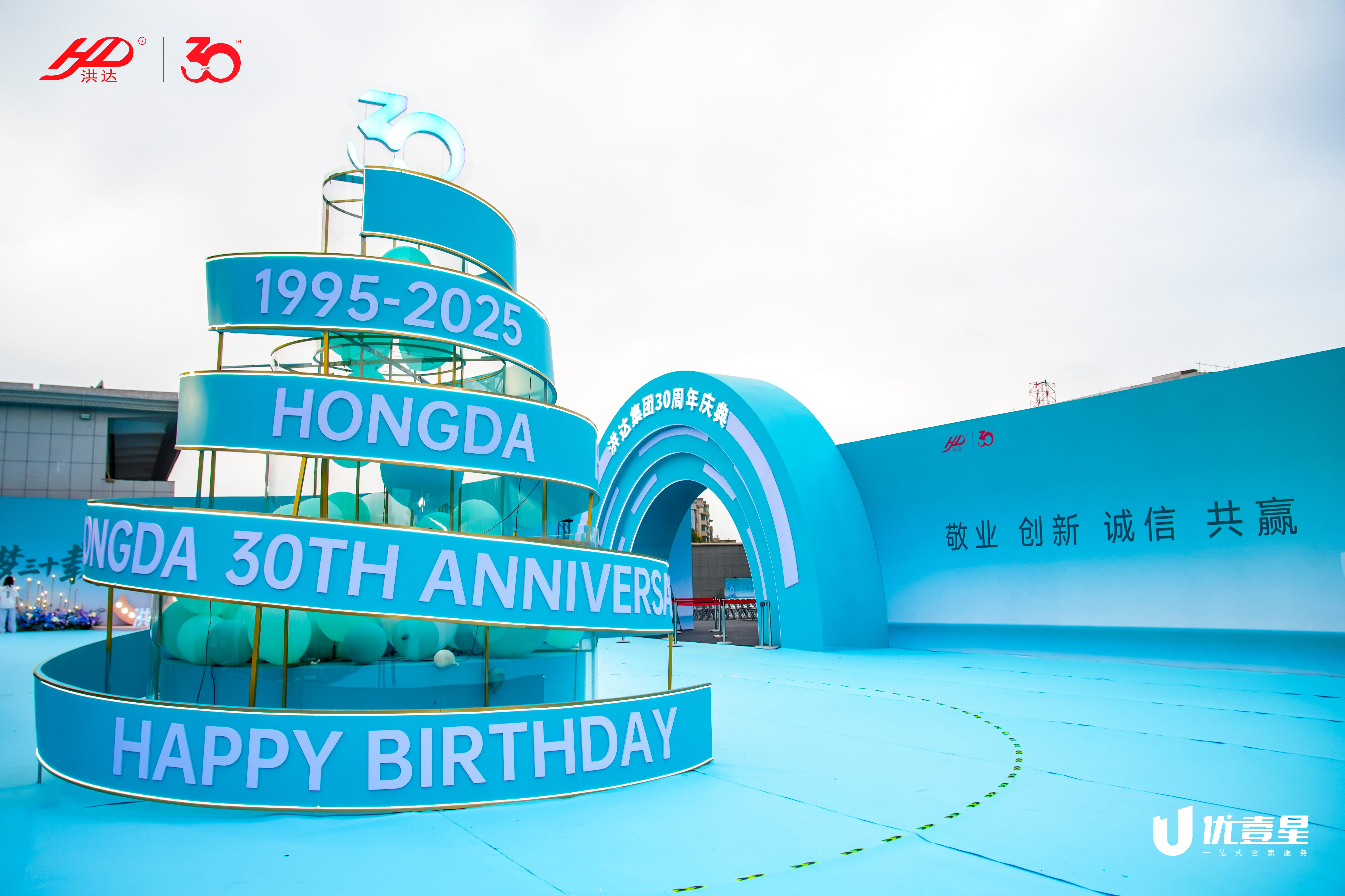 场地四周:悬挂气球、彩带、横幅(如“热烈庆祝洪达集团成立30周年”),设置发光导向标识。